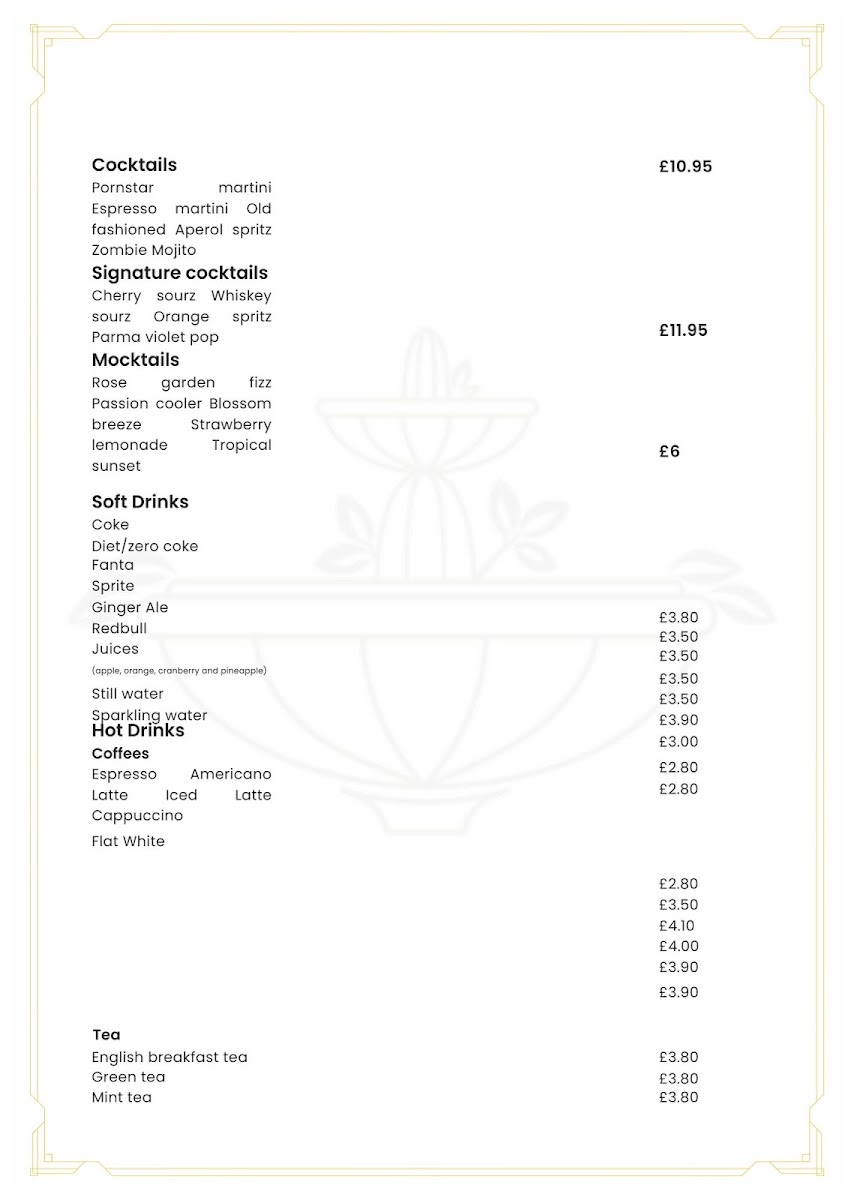 La Fontana is equally attentive to those with a sweet tooth, presenting a variety of vegan cakes and desserts including rich Chocolate Brownies and Coffee and Walnut Cake slices. The selection of drinks, from traditional English Breakfast Tea and Rooibos Tea to unique signature cocktails, rounds out an experience that is both relaxed and refined.